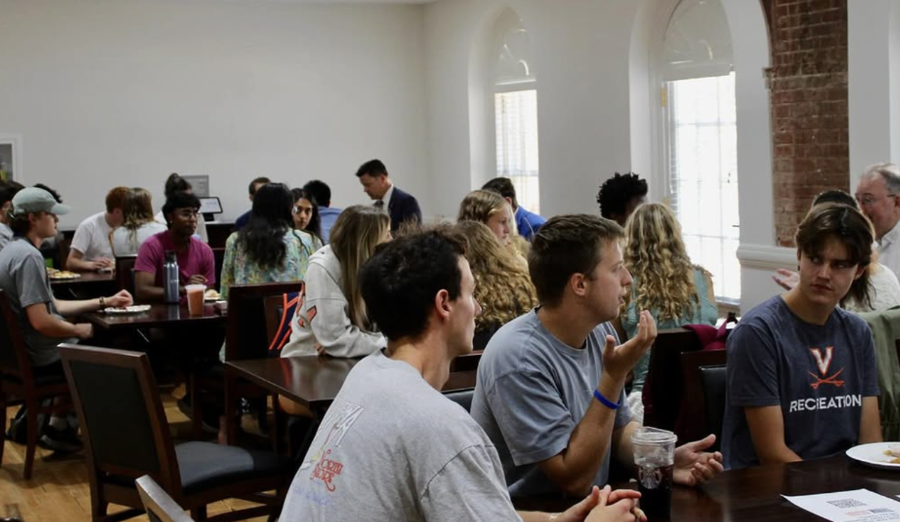 Casteen’s table inspired thoughtful debate about campus life and civic responsibility. Particularly, the residential colleges prompt sparked the most engaged discussion. Casteen, who serves as Director of Studies for Brown College, drew from his own experience living there to describe how residential learning communities blend academic life with social connection. He explained how the model encourages students and faculty to share meals, host discussions, and continue classroom debates in informal settings — fostering a sense of belonging that extends beyond academics. Students were divided; some supported expanding this approach to fraternity and sorority houses as a way to promote inclusion and civic engagement, while others defended the independence and traditions of Greek life as vital parts of UVA culture.