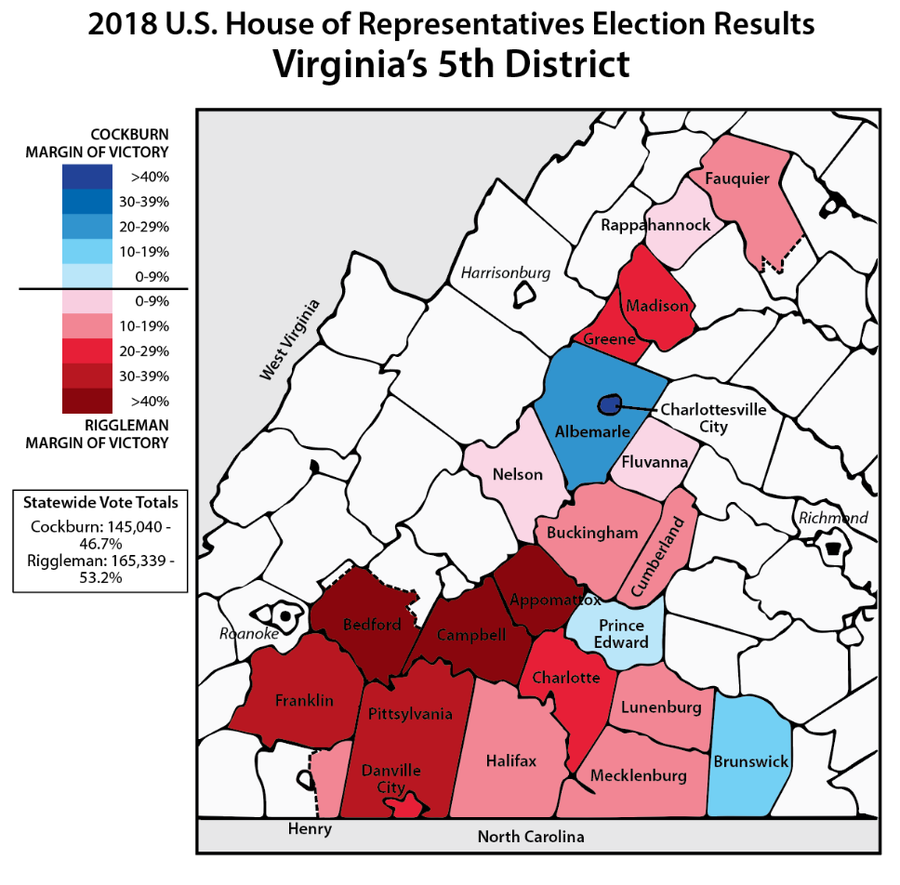 On November 6, Republican Denver Riggleman (R) won the election to represent Virginia’s fifth district in the U.S. House of Representatives. Riggleman, a businessman, beat journalist Leslie Cockburn (D) by a margin of 165,339 votes to 145,040, or 53.2% to 46.7%. (All election statistics analyzed in this article, and all statistics used to create these maps, come from the Virginia Department of Elections, unless otherwise noted.) Riggleman now replaces former Republican representative Tom Garrett, who decided not to pursue reelection after announcing he had struggled with alcoholism.