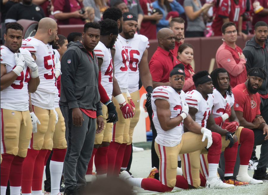WXRIMG0 “Washington Redskins National Anthem Kneeling” by Keith Allison is licensed under CC-BY-SA-2.0