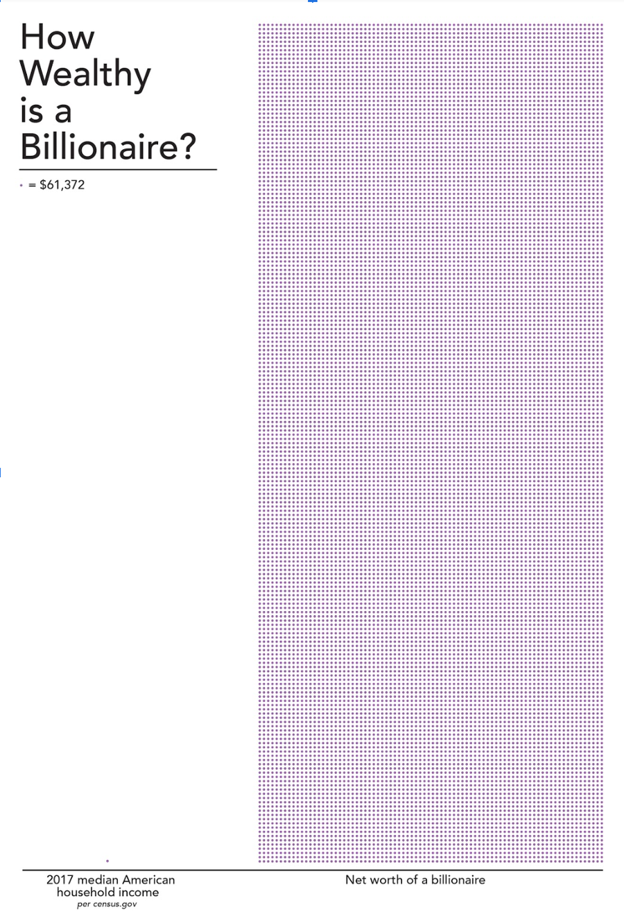 The chart shows that possessing a billion dollars is immoral, especially within the contest of American capitalism. A billion dollars towers over the average American’s wealth. A person with $1,000,000,000 commands 16,294 times the amount of wealth of a normal household. Our capitalistic ethos suggests that hard work will be rewarded accordingly — but it is not possible to work 16,294 times as hard as another person. It is not possible to be 16,294 times as smart as another person. Controlling a billion dollars shows that the system is immoral because it shows the lie at the heart of that system: equal work does not result in equal reward.